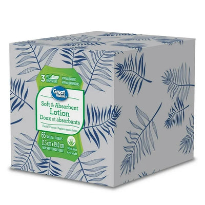 Great Value, Facial Tissues with lotion, 65 tissues per box, 3Ply, 65 Tissues in total