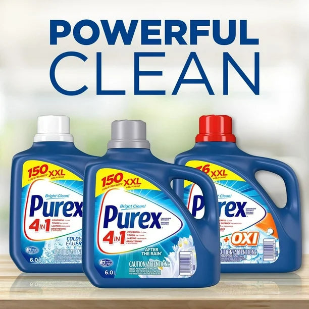 Purex Liquid Laundry Detergent in the After the Rain scent delivers powerful cleaning with a refreshing fragrance. This 6-liter formula is High-Efficiency Compatible (HEC), making it suitable for both standard and HE washing machines. Designed for up to 150 loads, it effectively removes stains and dirt while maintaining fabric brightness. Ideal for families or high-volume laundry needs, this detergent combines performance and value in every wash.