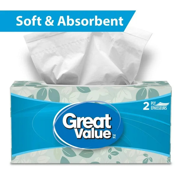 Great Value, Facial Tissues, 1 flat box, 126 tissues per box, 2Ply, 126 Tissues in total