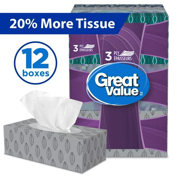 Great Value, Facial Tissues, 12 flat boxes, 88 tissues per box, 3Ply, 1,056 Tissues in total